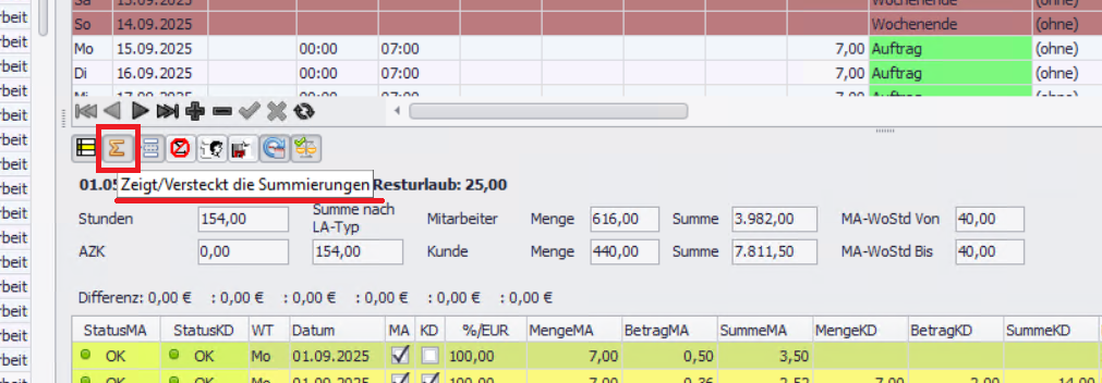 Falls diese Summierungen nicht sichtbar sind, kann der Bereich über den Button „Zeigt/Versteckt die Summierungen“ eingeblendet werden.