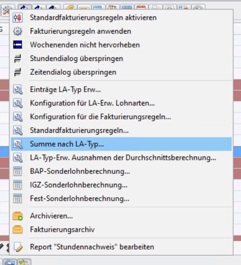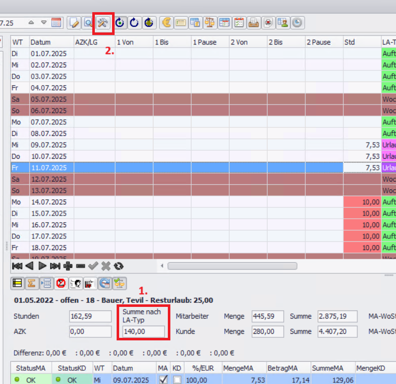 Neben dem allgemeinen Stundenfeld befindet sich der Bereich „Summe nach LA Typ“ (Kennzeichnung 1. im Screenshot).