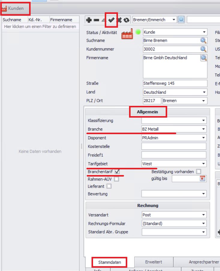 Prüfen Sie im rechten Bereich „Kundenzuschläge“, ob die Lohnart Branchenzuschlag aufgeführt ist.