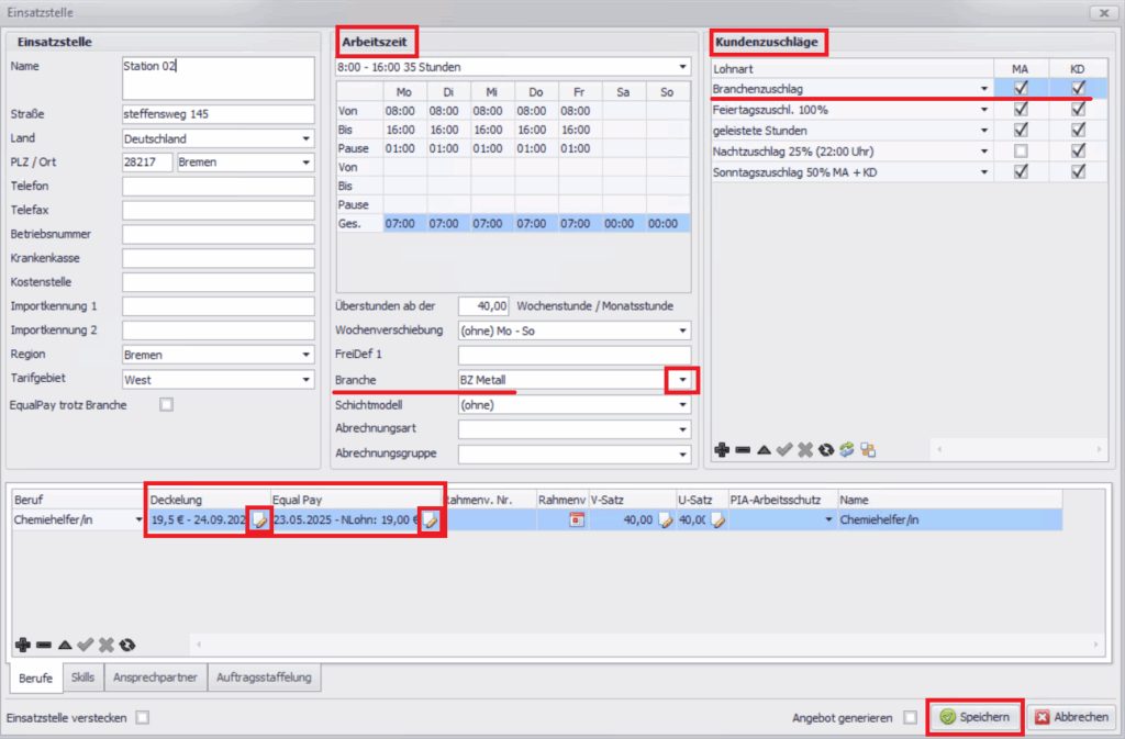 Branchenzuschlag in der Einsatzstelle hinterlegen