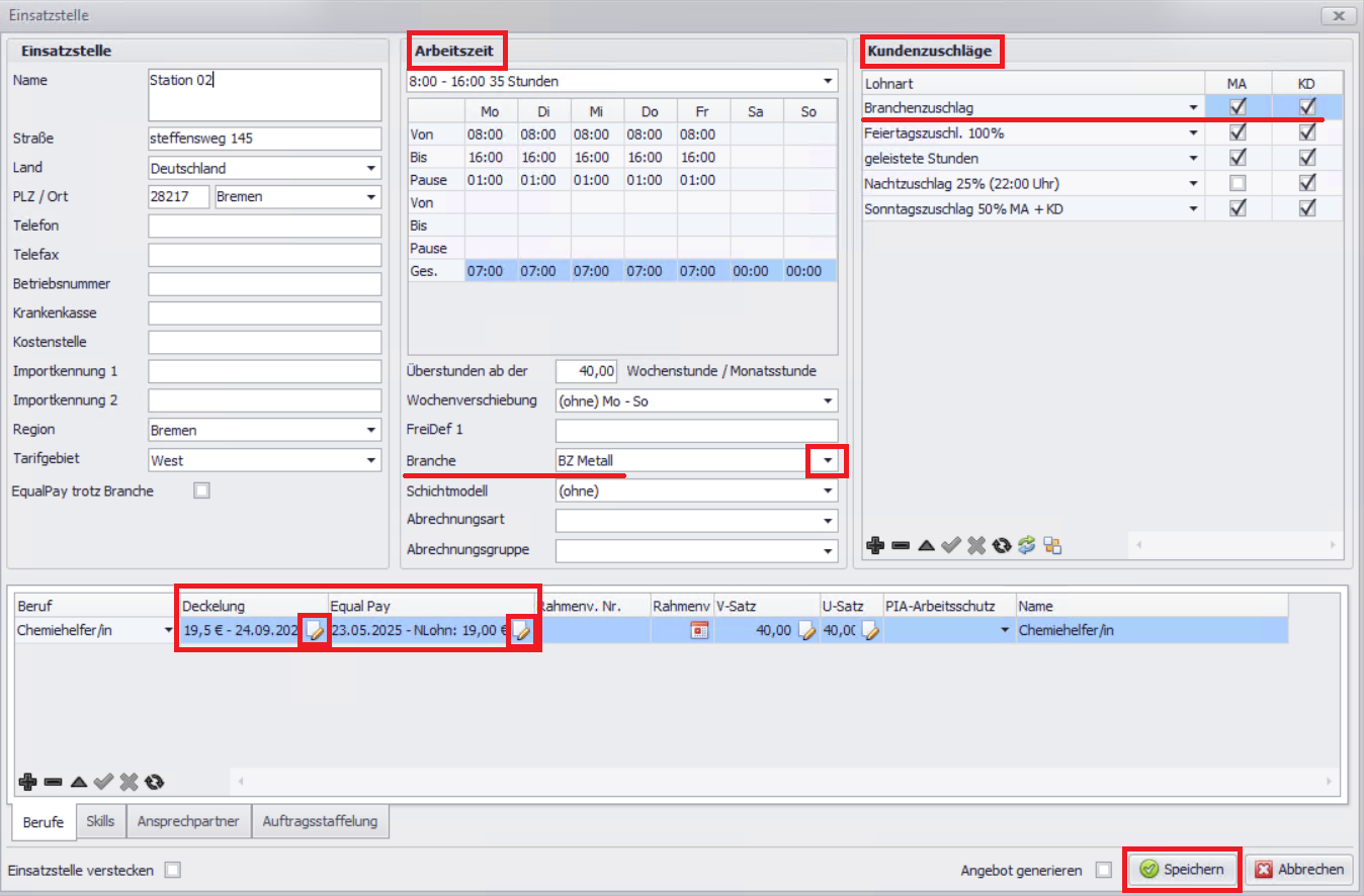 Branchenzuschlag in der Einsatzstelle hinterlegen