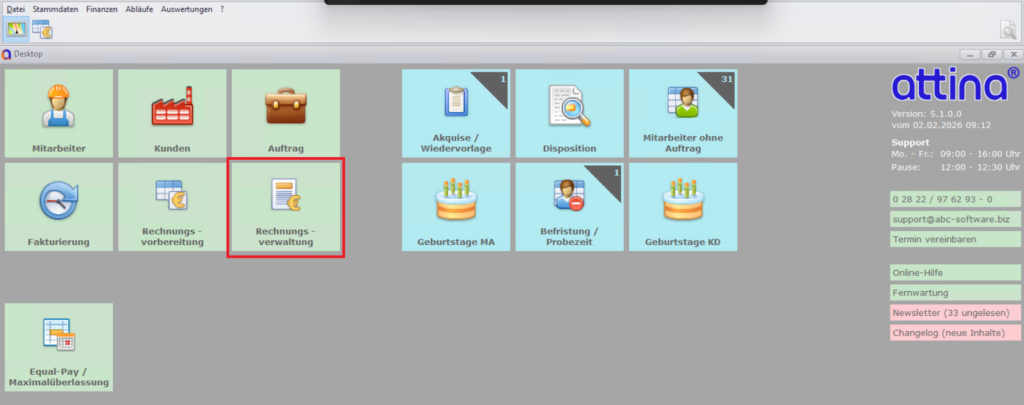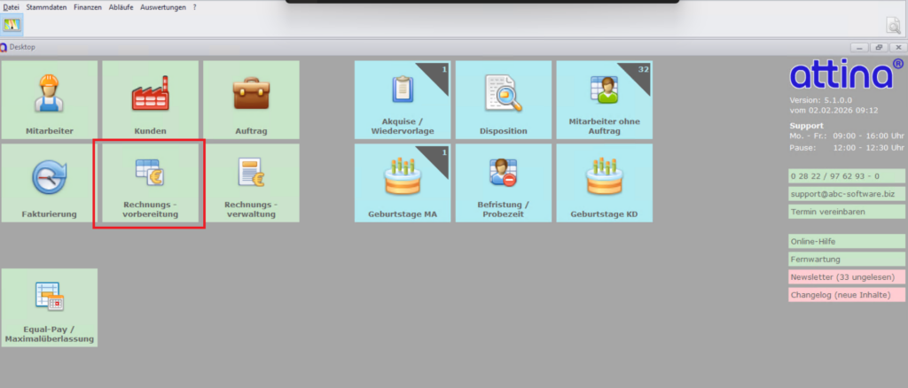 • Über den Attina Desktop können Sie die Kachel „Rechnungsvorbereitung“ auswählen.