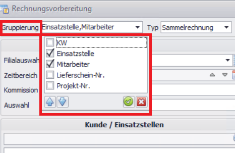In der Rechnungsvorbereitung wählen Sie in der oberen Leiste zunächst die gewünschte Gruppierung aus.