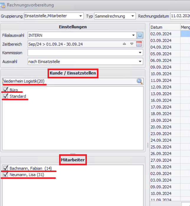 Direkt darunter wählen Sie den Kunden und/oder die Einsatzstelle(n) aus, die auf der Rechnung erscheinen sollen. Anschließend markieren Sie die Person(en), die für Ihren Kunden abgerechnet werden sollen.