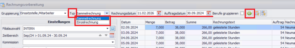 Danach legen Sie fest, ob die Rechnung als Typ: Sammelrechnung (summierte Ansicht) oder Typ: Einzelrechnung (detaillierte Ansicht) erstellt werden soll.