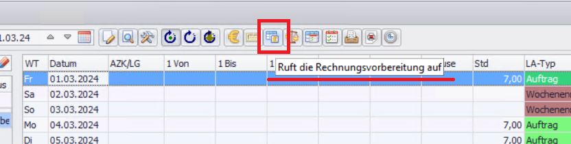 Wichtig: Man muss vorher einen Wochentag auswählen, an dem LA-Typ: Auftrag vorhanden ist. Nur dann öffnet sich die passende Rechnungsvorbereitung für den richtigen Mitarbeiter und den richtigen Kunden. Wird stattdessen z.B. LA-Typ: Wochenende ausgewählt, öffnet sich zwar ebenfalls die Rechnungsvorbereitung, jedoch nicht für den korrekten Mitarbeiter bzw. Kunden.