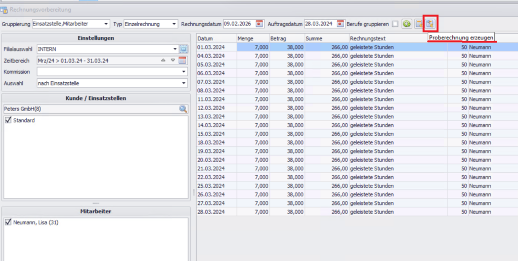 Mit dem Button „Proberechnung erzeugen“ wird eine vorläufige Rechnung erstellt. Diese kann überprüft und über das Druckersymbol als Report angezeigt oder ausgedruckt werden.