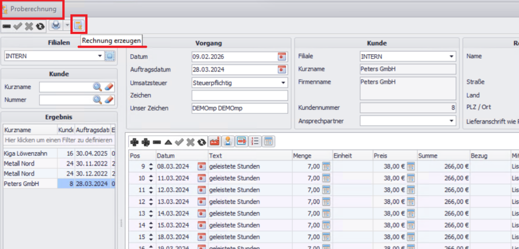 Ist alles korrekt, kann aus der Proberechnung direkt über „Rechnung erzeugen“ eine endgültige Rechnung erstellt werden. Der Status KD, in der Fakturierung ändert sich dabei von „Probe-RG“ zu „Rechnung“.