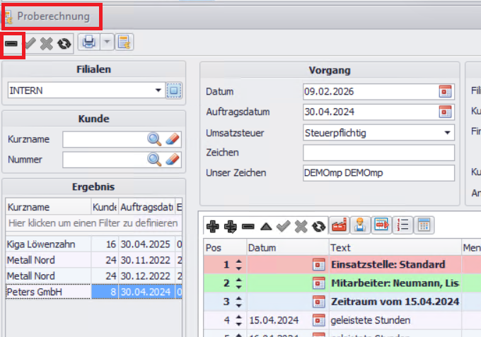 Soll eine Proberechnung gelöscht werden, kann dies in der Proberechnung selbst über das Minuszeichen erfolgen. In diesem Fall erscheint in der Fakturierung wieder der Status KD „OK“.