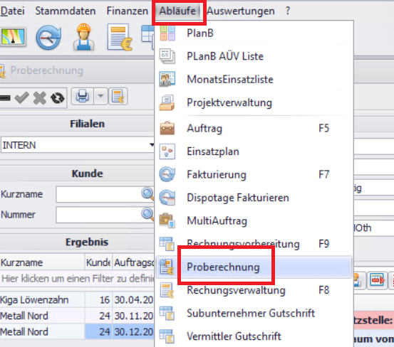 Offene oder ältere Proberechnungen können über Abläufe → Proberechnung geöffnet, geprüft und bei Bedarf in endgültige Rechnungen umgewandelt werden.