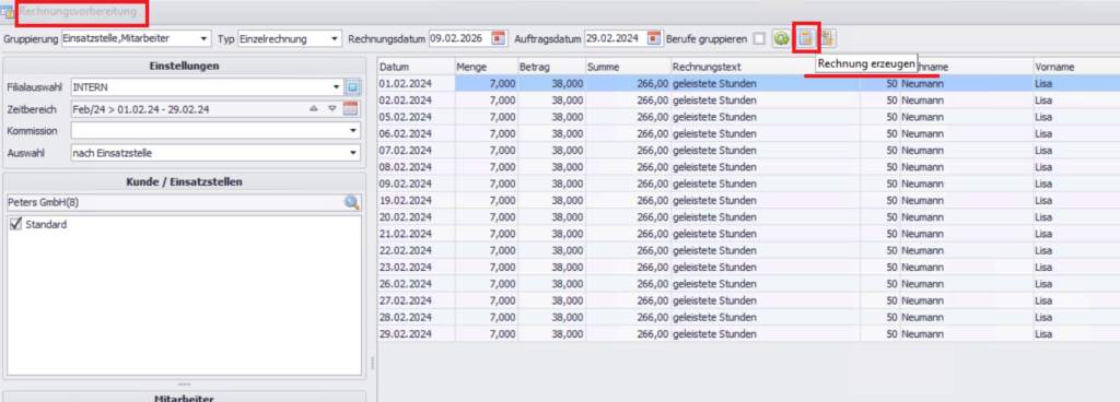 In der Rechnungsvorbereitung kann mit dem Button „Rechnung erzeugen“ auch direkt eine Rechnung erstellt werden.
