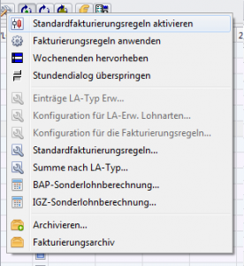 Im oberen Bereich der „Fakturierung“ sehen sie die Toolbar mit den bereits bekannten Funktionen. Hierzu zählen die Funktionen „LA-Typen eines Mitarbeiters“ „EqualPay Check“, „AZK-Liste eines Mitarbeiters“, „Stunden pro Monat“, „Ruft den Lohncheck auf“, „Ruft die Lohnübergabe auf“ und „Ruft die Rechnungsvorbereitung auf“.