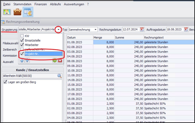 Oben neben „Gruppierung“ auf den Pfeil klicken und Haken setzen bei Projekt-Nr. . Jetzt erscheint die Projekt-Nr. auch auf Ihren Rechnungsformularen: