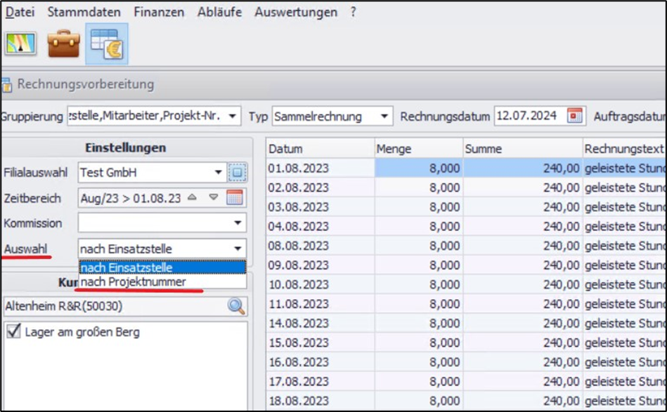 Damit die Projektnummer für Sie auf den Rechnungsformularen sichtbar wird, gehen Sie bitte in die Rechnungsvorbereitung (Menü – Abläufe – Rechnungsvorbereitung).