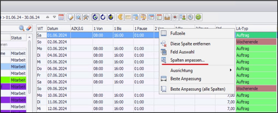 Wenn Sie die Spaltenansicht in der Fakturierung ändern möchten, klicken Sie mit der rechten Maustaste auf die oberste Zeile und wählen Sie „Spalten anpassen…“ aus.
