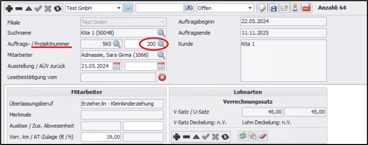 Im Modul Auftrag, oben neben der Auftragsnummer, tragen Sie die Projektnummer ein: