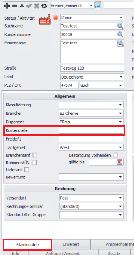 Eine Kostenstelle kann im Modul Kunde / Reiter Stammdaten hinterlegt werden.