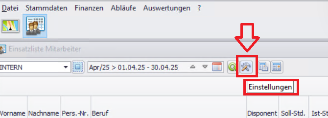 Über den Werkzeug-Button in der oberen Leiste können Sie die Ansicht der Monatseinsatzliste individuell konfigurieren.