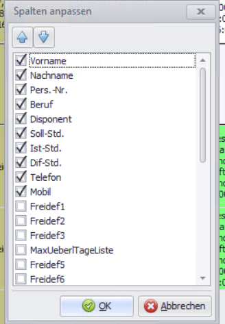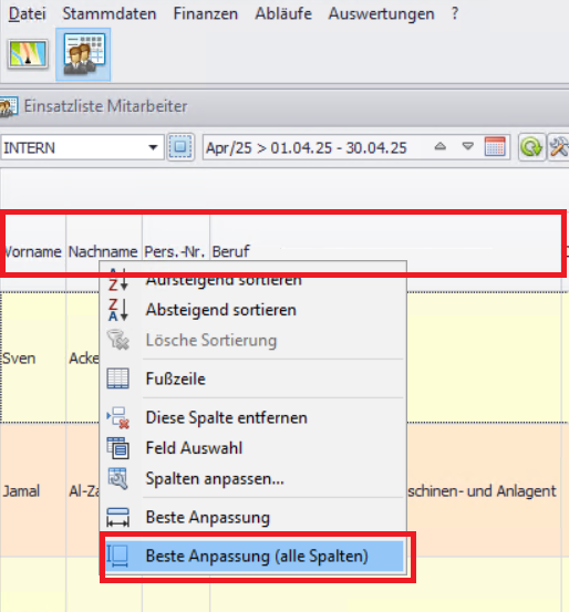 Per Rechtsklick auf eine Spaltenüberschrift (z. B. Vorname, Nachname, Pers.-Nr., Beruf) können Sie über „Spalten anpassen“ weitere Spalten einblenden.