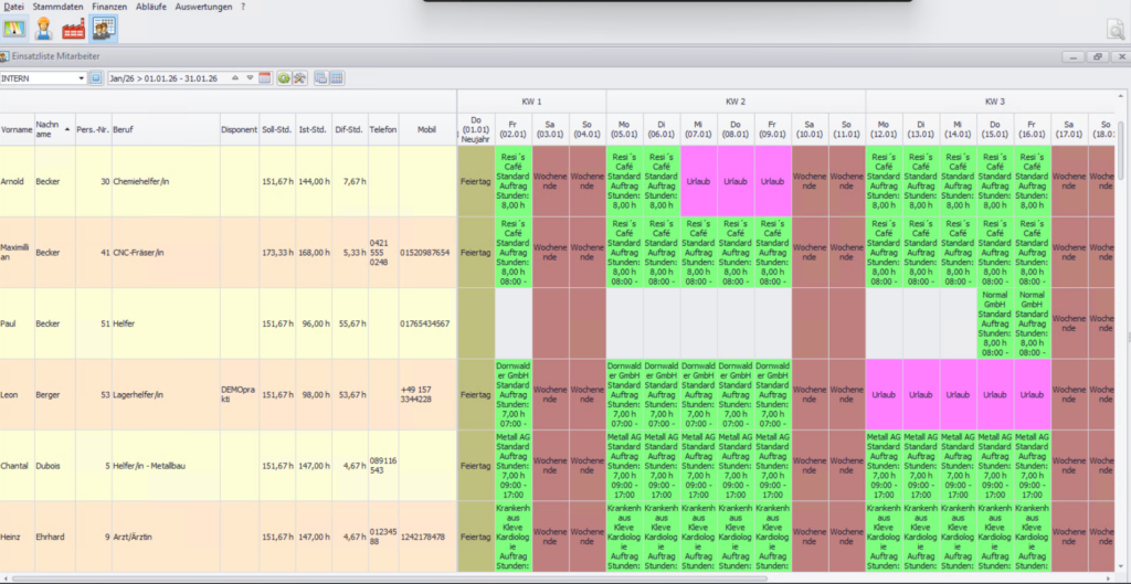 Die Liste zeigt nun eine vollständige Übersicht aller Mitarbeitereinsätze.