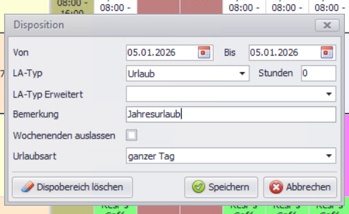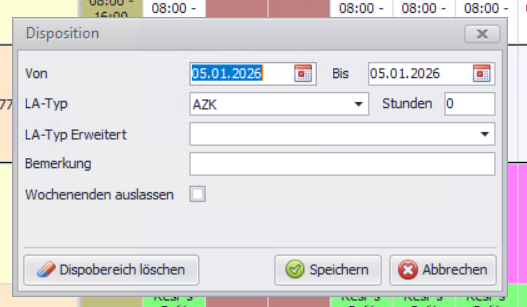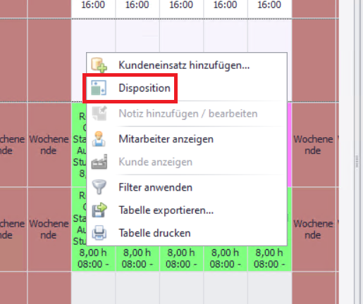 Ist bei einem Mitarbeiter ein freies Feld sichtbar, können Sie per Rechtsklick → Disposition z. B. folgende Einträge vornehmen: