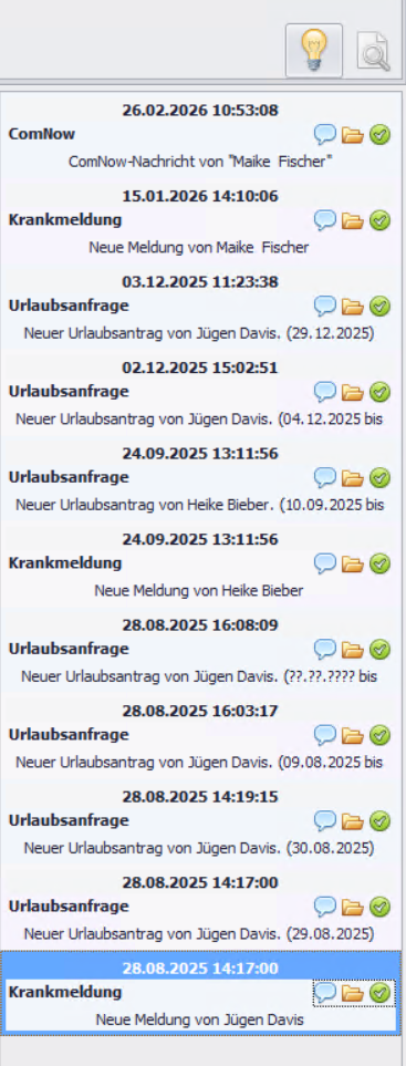 Ein einfacher Klick auf die blinkende Lampe öffnet die Schnellübersicht aller neuen Nachrichten – dazu gehören z. B. ComNow‑Textnachrichten, Krankmeldungen oder Urlaubsanfragen.