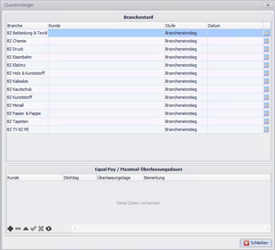 Es öffnet sich ein neues Fenster, in dem Sie Angaben zum Branchentarif, Equal Pay und Höchstüberlassungsdauer machen können.