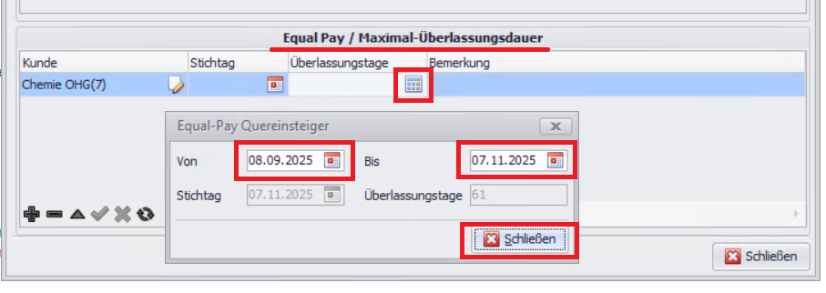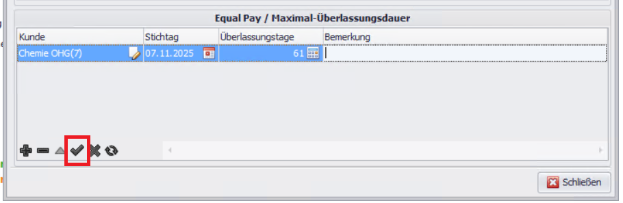 - Schließen Sie das Fenster – die Anzahl der Überlassungstage wird automatisch übernommen.
