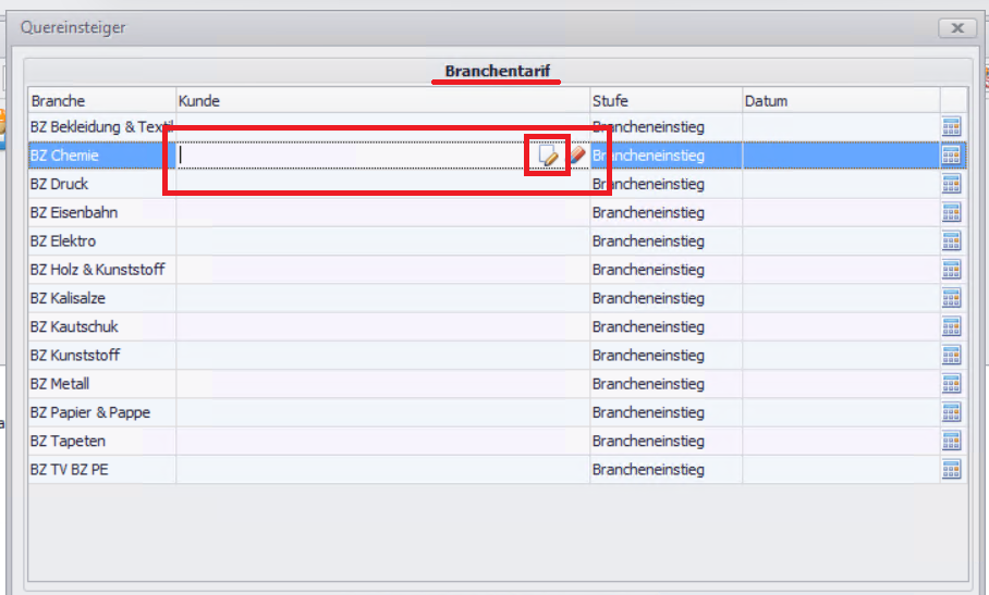 - Klicken Sie nun im oberen im Bereich „Branchentarif“ in die leere Zeile neben der entsprechenden Branche. Daraufhin erscheint das Bearbeiten-Symbol (Zettel und Stift).
