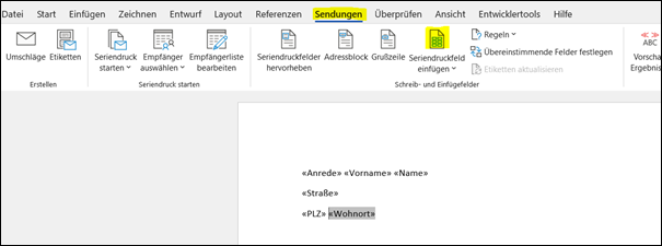 wo die Informationen erscheinen sollen. Gehen Sie oben auf „Sendungen“ und klicken Sie auf das Bild „Seriendruckfeld einfügen“.